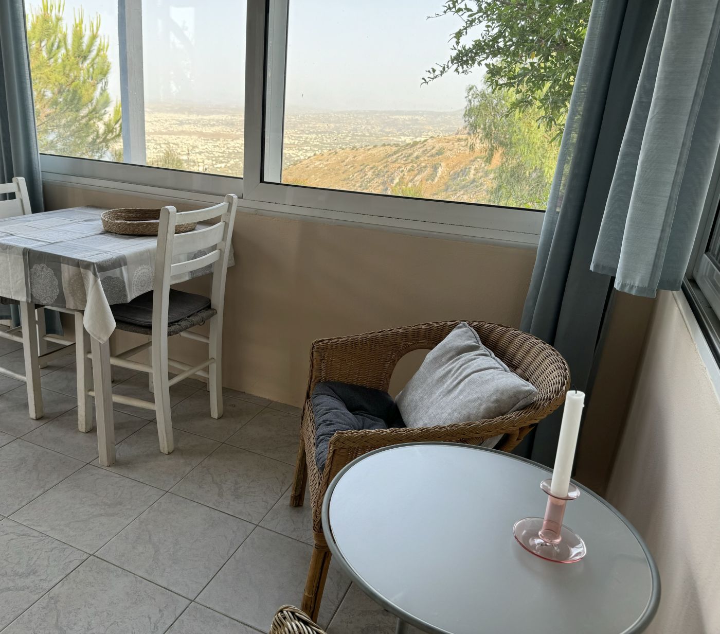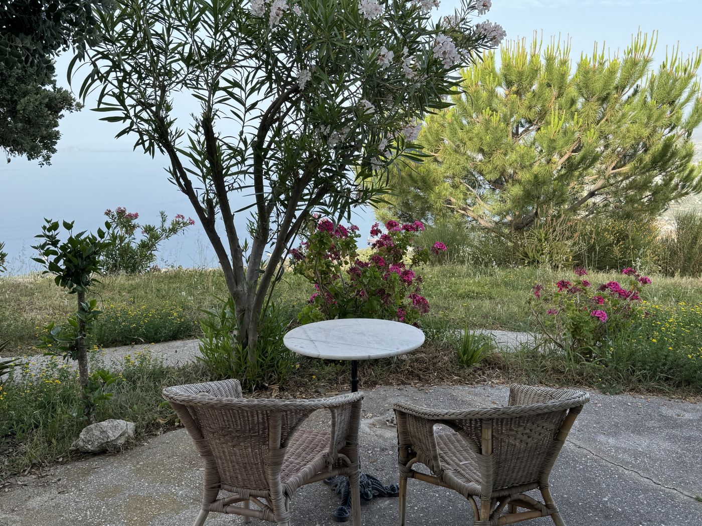 Der er en overdækket terrasse udenfor med cafesæt, hvor du kan sidde og nyde stilheden og udsigten over den smukke Grund, Heraklion by og Middelhavet.
