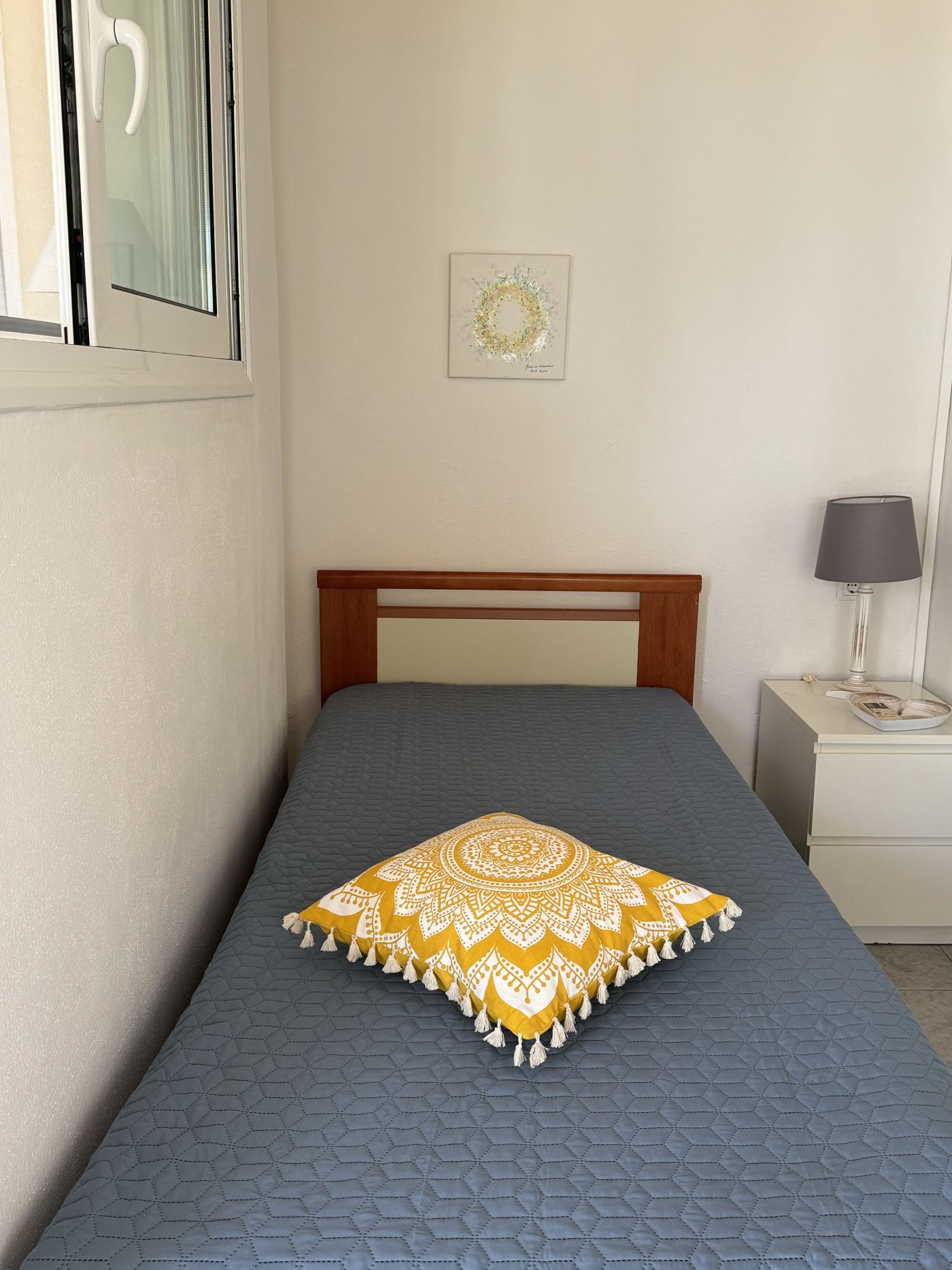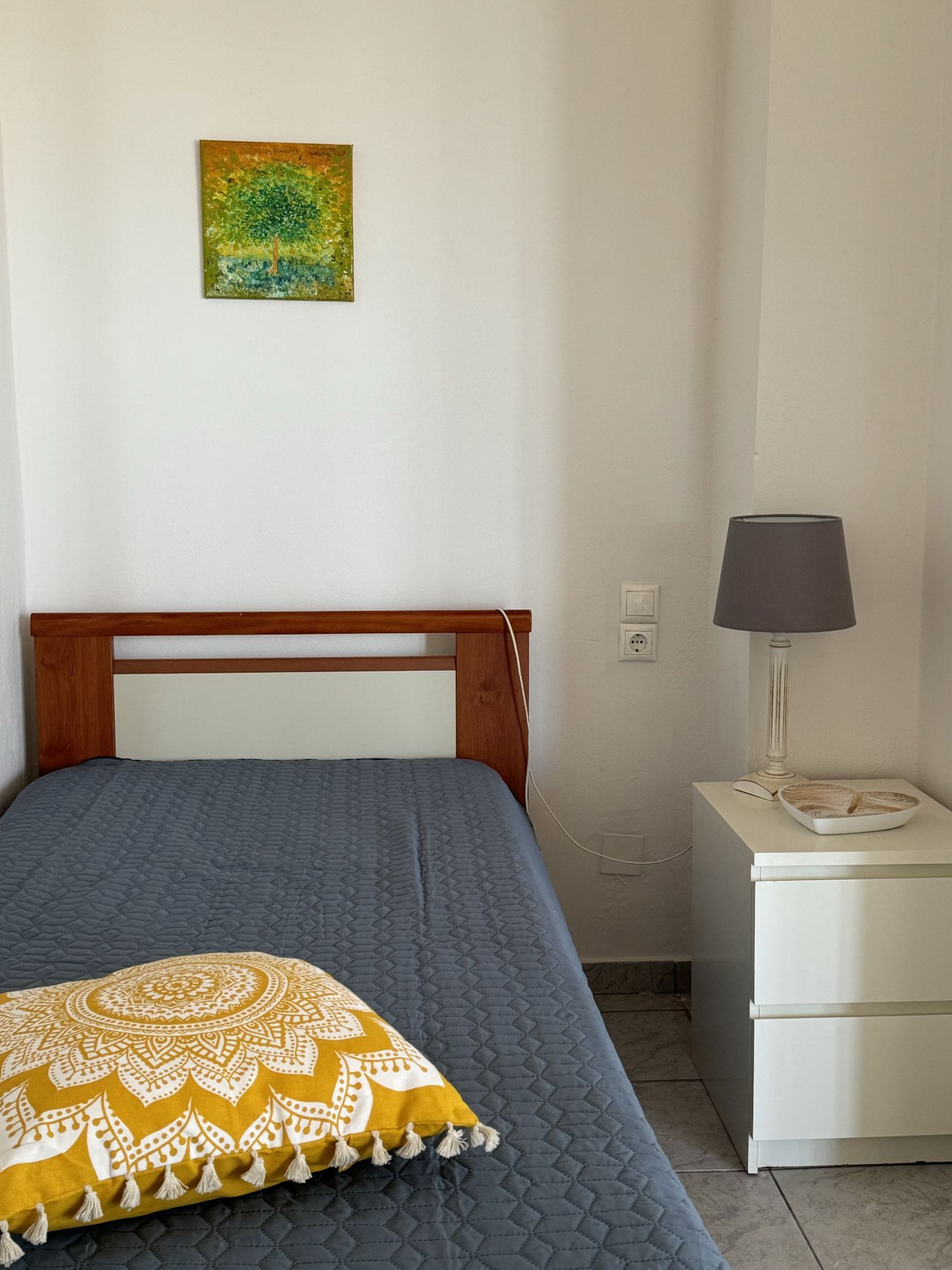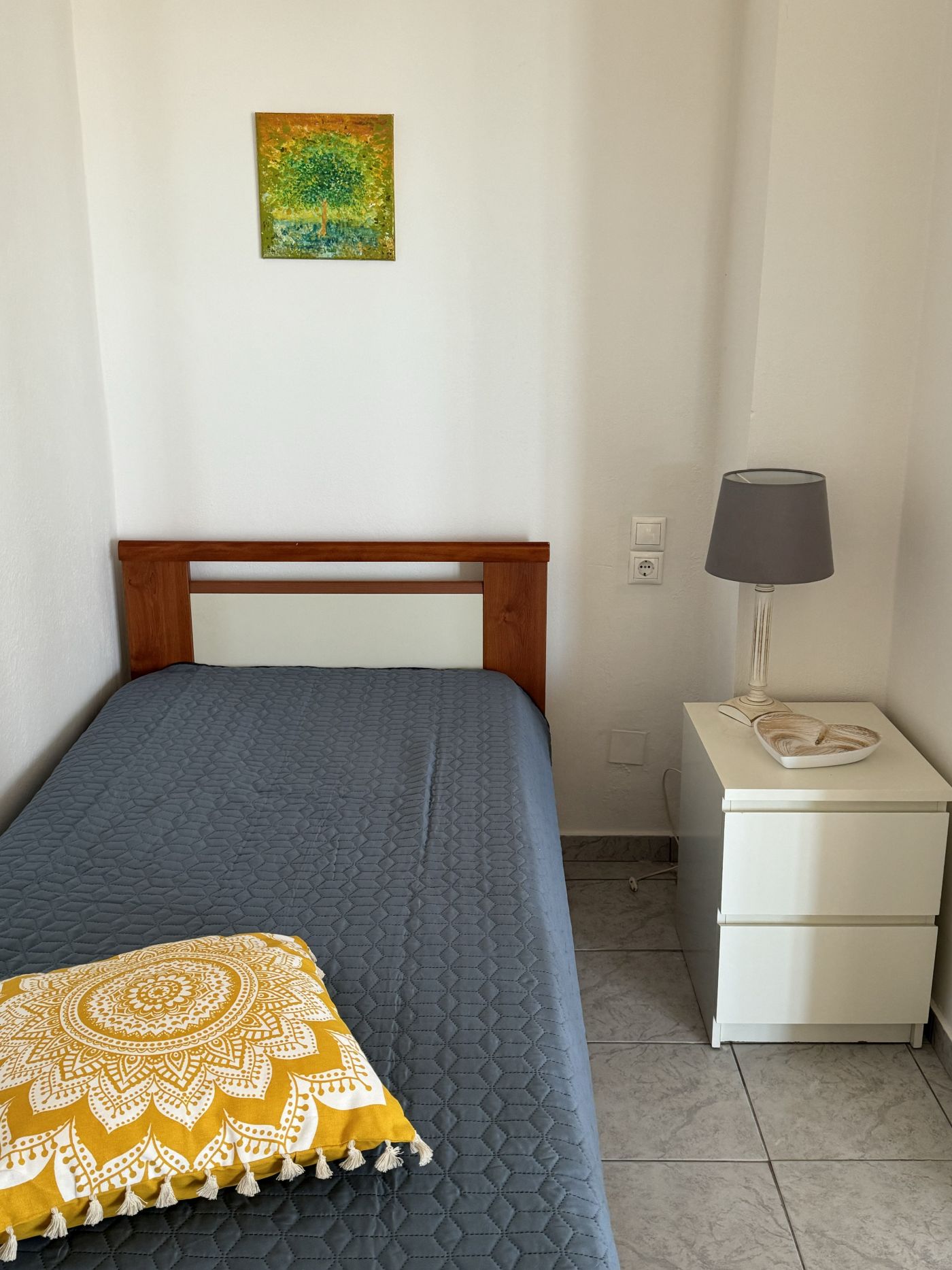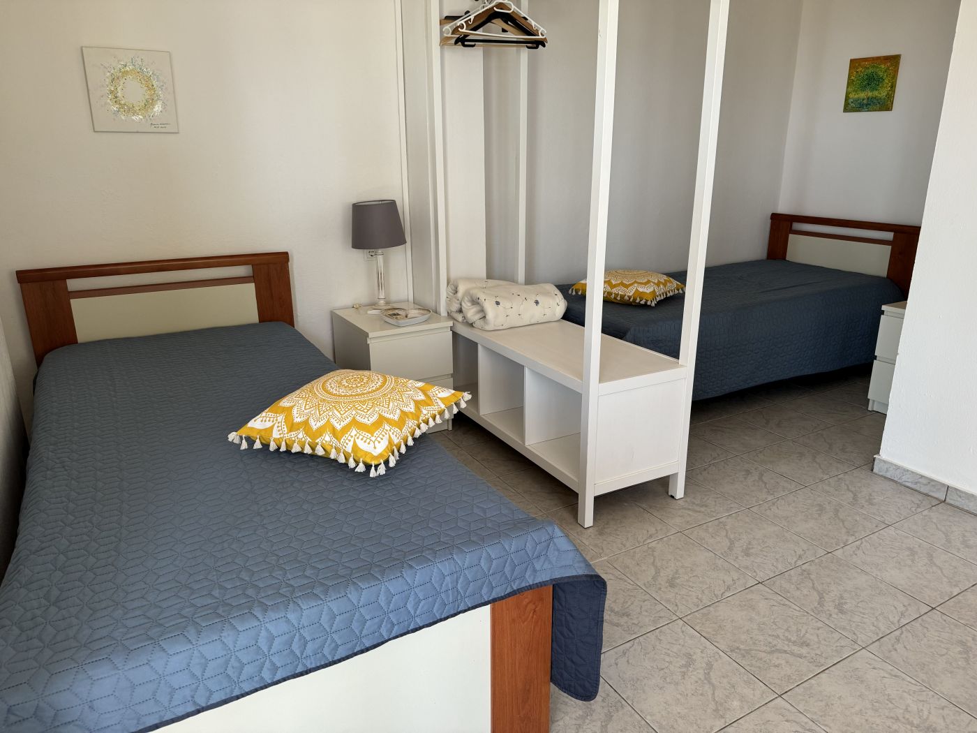 Lejligheden er møbleret med 2 enkeltsenge, sengeborde, skabsarrangement, lille køkken med 2 kogeplader, og bad/toilet.