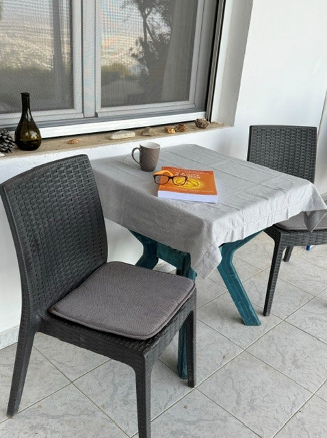 Der er en overdækket terrase udenfor med bord og stole til fælles brug, hvor du kan sidde og nyde stilheden og udsigten over den smukke grund, Heraklion by og Middelhavet.