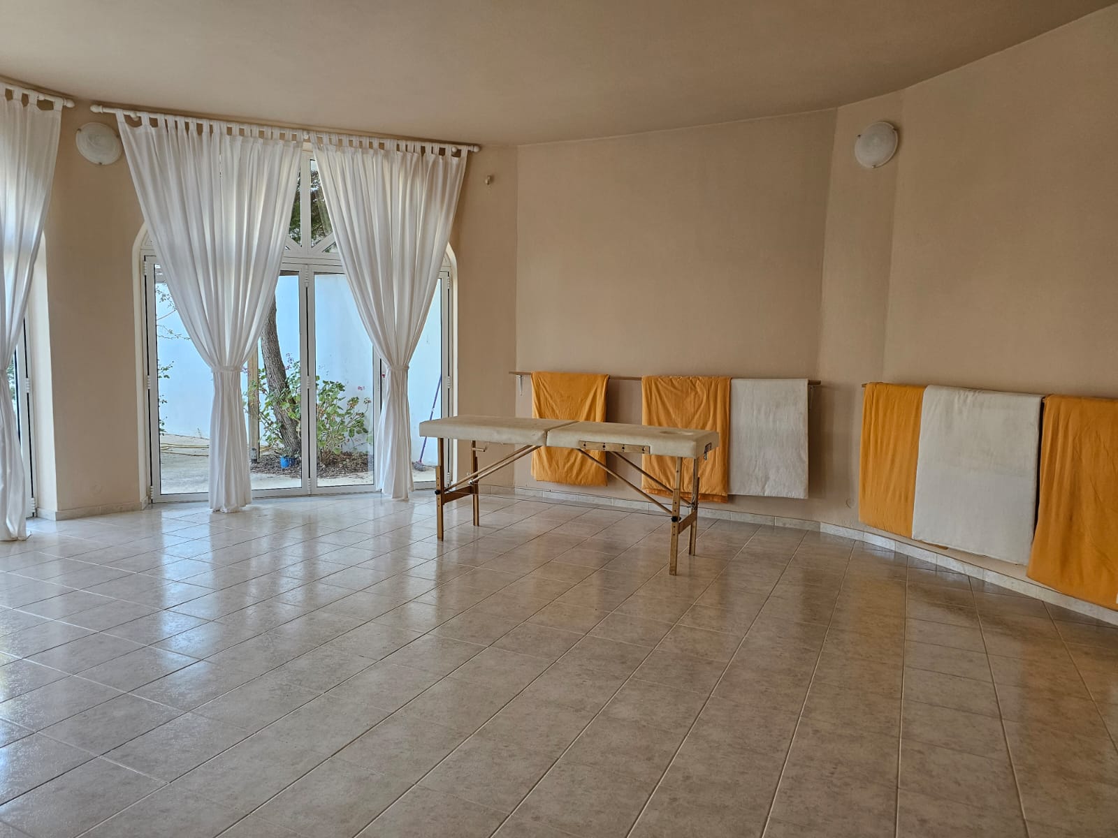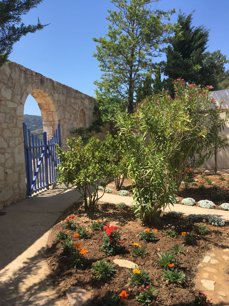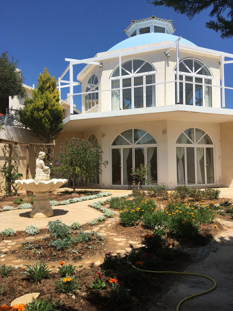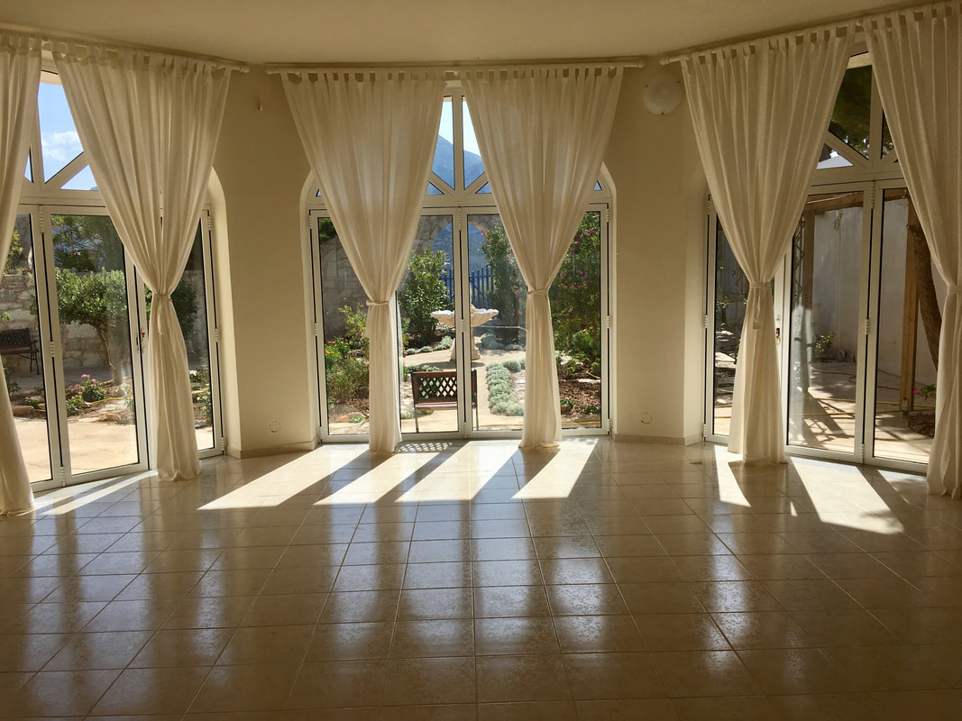 Tempelbygningen har lystemplet i overetagen, og et rum til kropslige og kreative aktiviteter i underetagen. Udenfor det kreative rum i underetagen finder du den smukke tempelhave.